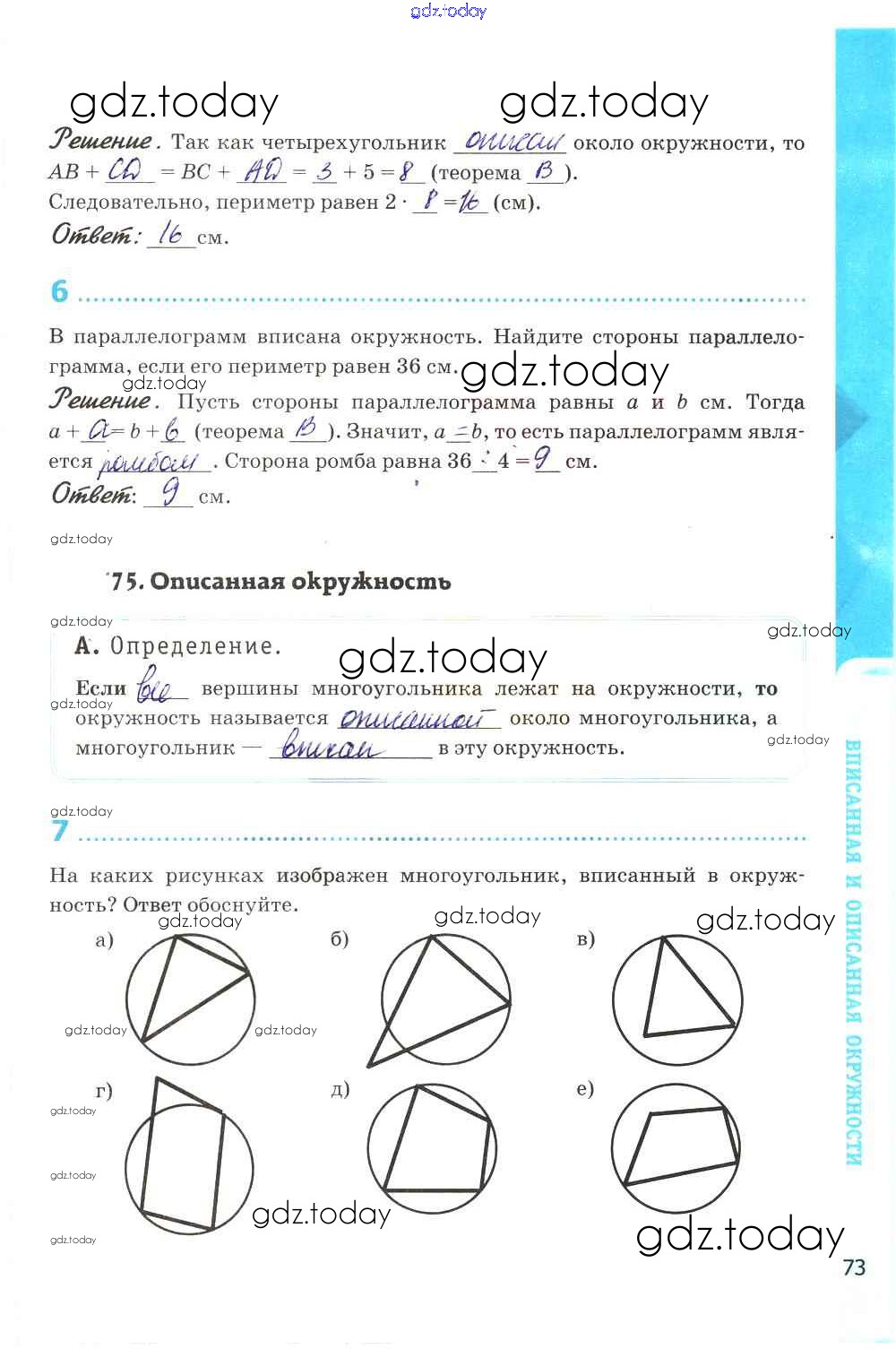 Ответы к Решение к главе VIII. Окружность стр. 73 Рабочей тетради по Геометрии для 8 класса Глазков, Камаев Экзамен УМК 2017