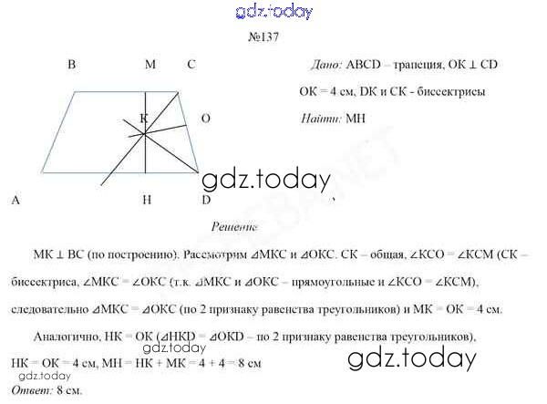 На страницах сайта gdz.today вы найдете учебный и вспомогательный материал, направленный на улучшения знаний школьной программы. ГДЗ - онлайн мир знаний Задачи (решение) 137 Учебнику по Геометрии для 8 класса Казаков Народная асвета 2018