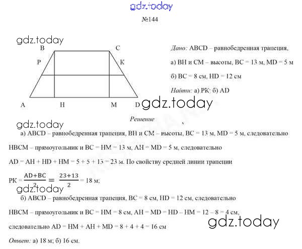 На страницах сайта gdz.today вы найдете учебный и вспомогательный материал, направленный на улучшения знаний школьной программы. ГДЗ - онлайн мир знаний Задачи (решение) 144 Учебнику по Геометрии для 8 класса Казаков Народная асвета 2018