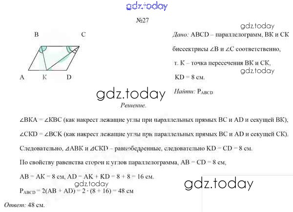 На страницах сайта gdz.today вы найдете учебный и вспомогательный материал, направленный на улучшения знаний школьной программы. ГДЗ - онлайн мир знаний Задачи (решение) 27 Учебнику по Геометрии для 8 класса Казаков Народная асвета 2018