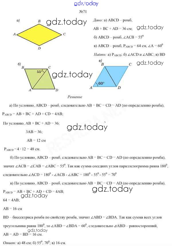 На страницах сайта gdz.today вы найдете учебный и вспомогательный материал, направленный на улучшения знаний школьной программы. ГДЗ - онлайн мир знаний Задачи (решение) 71 Учебнику по Геометрии для 8 класса Казаков Народная асвета 2018