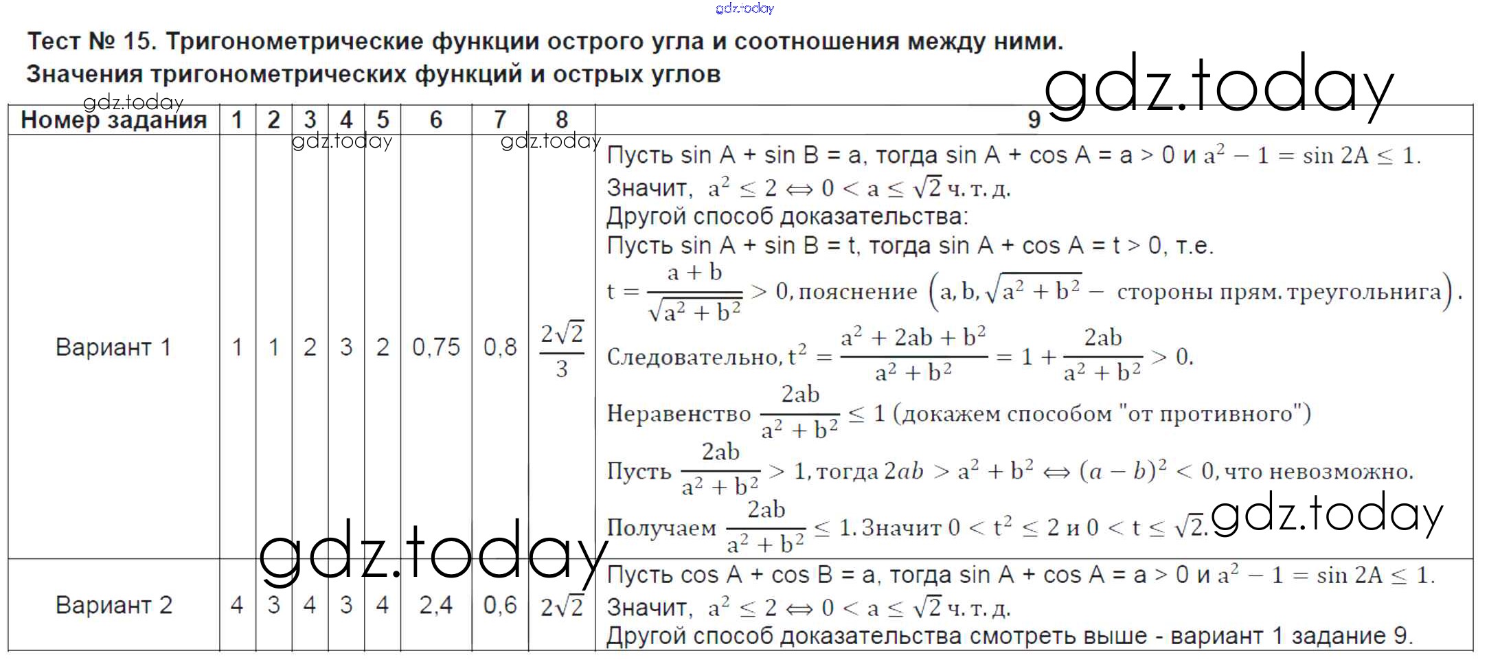 На страницах сайта gdz.today вы найдете учебный и вспомогательный материал, направленный на улучшения знаний школьной программы. ГДЗ - онлайн мир знаний Решение к тестам Тест №15. Тригонометрические функции острого угла и соотношения между ними Контрольно-измерительным материалам (КИМ) по Геометрии для 8 класса Рязановский, Мухин Экзамен 2014