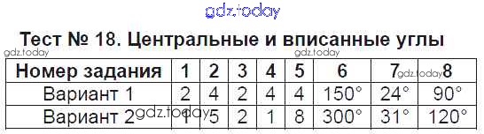 Ответы к Решение к тестам Тест №18. Центральные и вписанные углы Контрольно-измерительным материалам (КИМ) по Геометрии для 8 класса Рязановский, Мухин Экзамен 2014