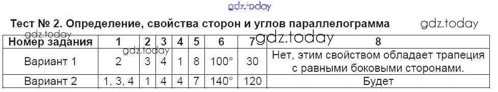 На страницах сайта gdz.today вы найдете учебный и вспомогательный материал, направленный на улучшения знаний школьной программы. ГДЗ - онлайн мир знаний Решение к тестам Тест №2. Определение, свойства сторон и углов параллелограмма Контрольно-измерительным материалам (КИМ) по Геометрии для 8 класса Рязановский, Мухин Экзамен 2014