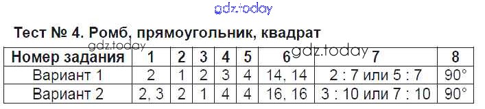 Ответы к Решение к тестам Тест №4. Ромб, прямоугольник, квадрат Контрольно-измерительным материалам (КИМ) по Геометрии для 8 класса Рязановский, Мухин Экзамен 2014