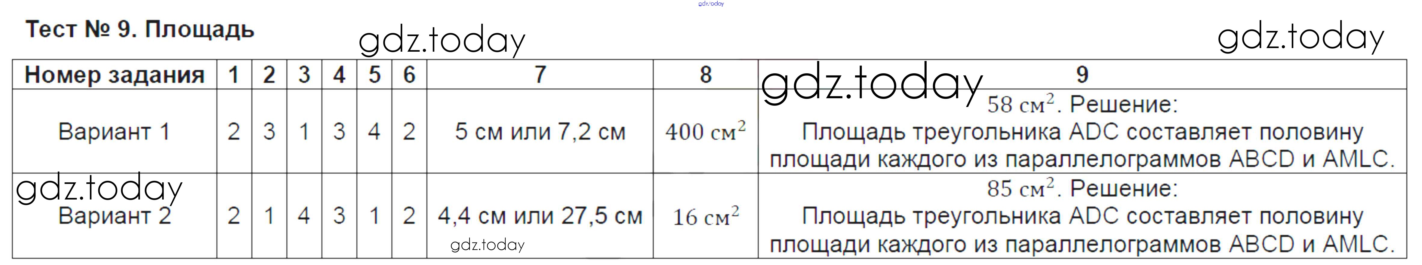 Ответы к Решение к тестам Тест №9. Площадь Контрольно-измерительным материалам (КИМ) по Геометрии для 8 класса Рязановский, Мухин Экзамен 2014