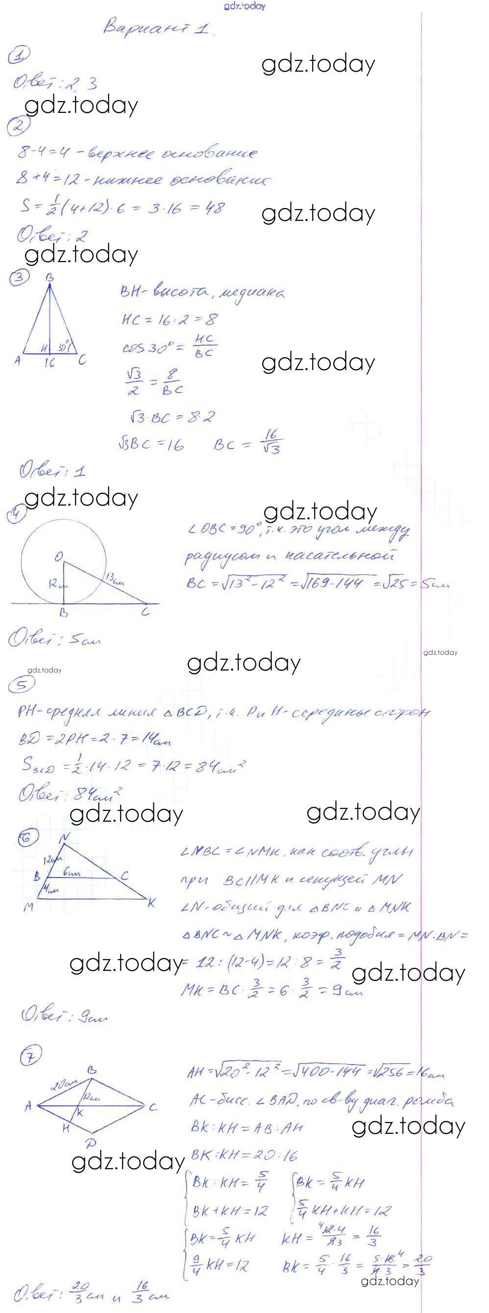 На страницах сайта gdz.today вы найдете учебный и вспомогательный материал, направленный на улучшения знаний школьной программы. ГДЗ - онлайн мир знаний Решение к контрольной работе №5. Итоговая Вариант №1 Контрольным работам по Геометрии для 8 класса Мельникова Экзамен УМК 2013