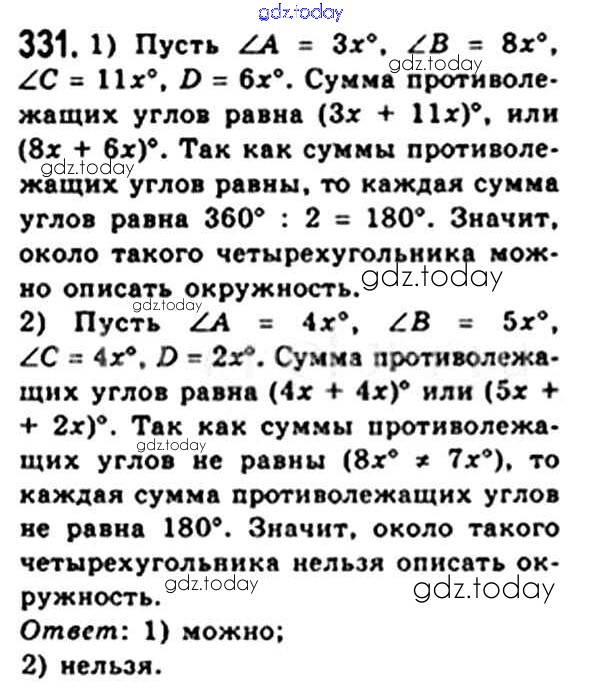 На страницах сайта gdz.today вы найдете учебный и вспомогательный материал, направленный на улучшения знаний школьной программы. ГДЗ - онлайн мир знаний § 10. Описанная и вписанная окружности четырехугольника Решение. Глава 1. Четырехугольники 331 Учебнику по Геометрии для 8 класса Мерзляк, Полонский Вентана-граф Алгоритм успеха 2015