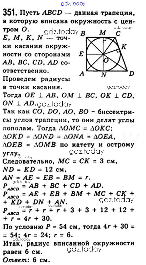 На страницах сайта gdz.today вы найдете учебный и вспомогательный материал, направленный на улучшения знаний школьной программы. ГДЗ - онлайн мир знаний § 10. Описанная и вписанная окружности четырехугольника Решение. Глава 1. Четырехугольники 351 Учебнику по Геометрии для 8 класса Мерзляк, Полонский Вентана-граф Алгоритм успеха 2015