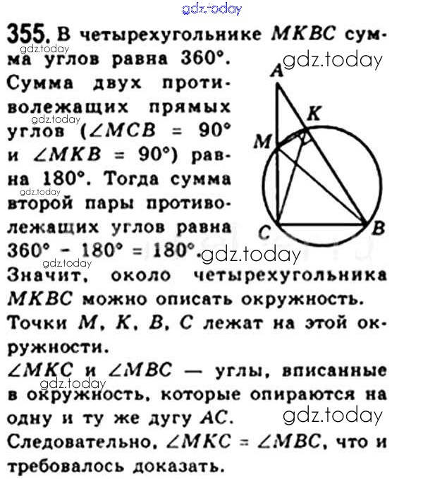 На страницах сайта gdz.today вы найдете учебный и вспомогательный материал, направленный на улучшения знаний школьной программы. ГДЗ - онлайн мир знаний § 10. Описанная и вписанная окружности четырехугольника Решение. Глава 1. Четырехугольники 355 Учебнику по Геометрии для 8 класса Мерзляк, Полонский Вентана-граф Алгоритм успеха 2015