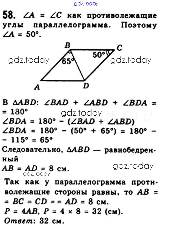 Ответы к § 2. Параллелограмм. Свойства параллелограмма Решение. Глава 1. Четырехугольники 58 Учебнику по Геометрии для 8 класса Мерзляк, Полонский Вентана-граф Алгоритм успеха 2015