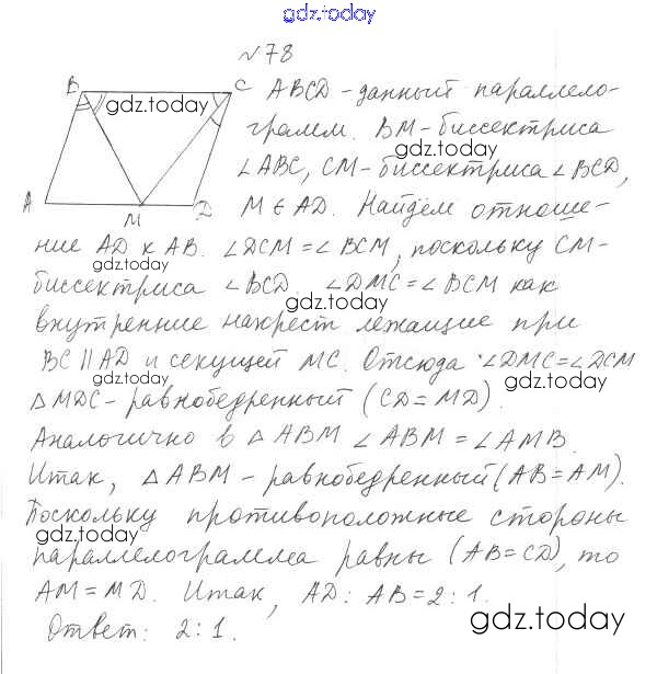 Ответы к § 2. Параллелограмм. Свойства параллелограмма Решение. Глава 1. Четырехугольники 78 Учебнику по Геометрии для 8 класса Мерзляк, Полонский Вентана-граф Алгоритм успеха 2015