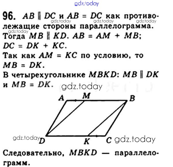 На страницах сайта gdz.today вы найдете учебный и вспомогательный материал, направленный на улучшения знаний школьной программы. ГДЗ - онлайн мир знаний § 3. Признаки параллелограмма Решение. Глава 1. Четырехугольники 96 Учебнику по Геометрии для 8 класса Мерзляк, Полонский Вентана-граф Алгоритм успеха 2015