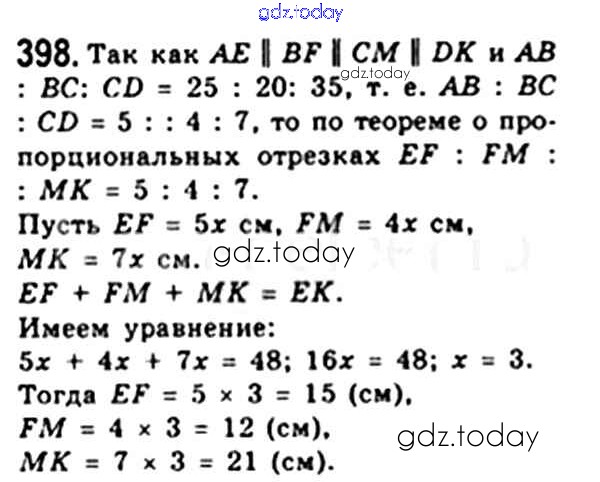 На страницах сайта gdz.today вы найдете учебный и вспомогательный материал, направленный на улучшения знаний школьной программы. ГДЗ - онлайн мир знаний § 11. Теорема Фалеса. Теорема о пропорциональных отрезках Решение. Глава 2. Подобие треугольников 398 Учебнику по Геометрии для 8 класса Мерзляк, Полонский Вентана-граф Алгоритм успеха 2015