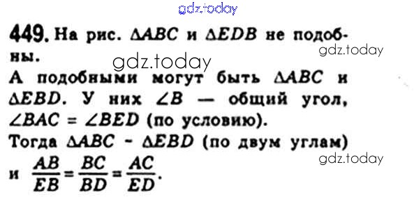 На страницах сайта gdz.today вы найдете учебный и вспомогательный материал, направленный на улучшения знаний школьной программы. ГДЗ - онлайн мир знаний § 13. Первый признак подобия треугольника. Свойство пересекающихся хорд. Свойство касательной и секущей. Теорема Менелая. Теорема Птолемея. Решение. Глава 2. Подобие треугольников 449 Учебнику по Геометрии для 8 класса Мерзляк, Полонский Вентана-граф Алгоритм успеха 2015