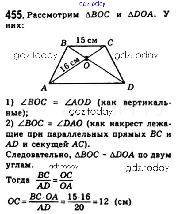 Ответы к § 13. Первый признак подобия треугольника. Свойство пересекающихся хорд. Свойство касательной и секущей. Теорема Менелая. Теорема Птолемея. Решение. Глава 2. Подобие треугольников 455 Учебнику по Геометрии для 8 класса Мерзляк, Полонский Вентана-граф Алгоритм успеха 2015