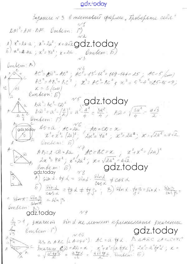 На страницах сайта gdz.today вы найдете учебный и вспомогательный материал, направленный на улучшения знаний школьной программы. ГДЗ - онлайн мир знаний Проверь себя Решение. Глава 3. Решение прямоугольных треугольников №3 Учебнику по Геометрии для 8 класса Мерзляк, Полонский Вентана-граф Алгоритм успеха 2015