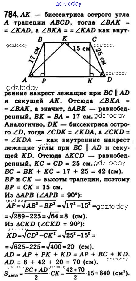 Ответы к § 23. Площадь трапеции Решение. Глава 4. Многоугольники. Площадь многоугольника 784 Учебнику по Геометрии для 8 класса Мерзляк, Полонский Вентана-граф Алгоритм успеха 2015