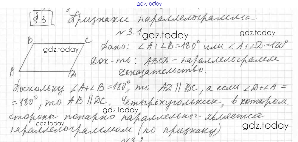 На страницах сайта gdz.today вы найдете учебный и вспомогательный материал, направленный на улучшения знаний школьной программы. ГДЗ - онлайн мир знаний § 3. Признаки параллелограмма Решение к главе 1. Многоугольники. Четырехугольники 1 Учебнику по Геометрии для 8 класса Мерзляк, Поляков Углубленный уровень Вентана-граф Алгоритм успеха 2020