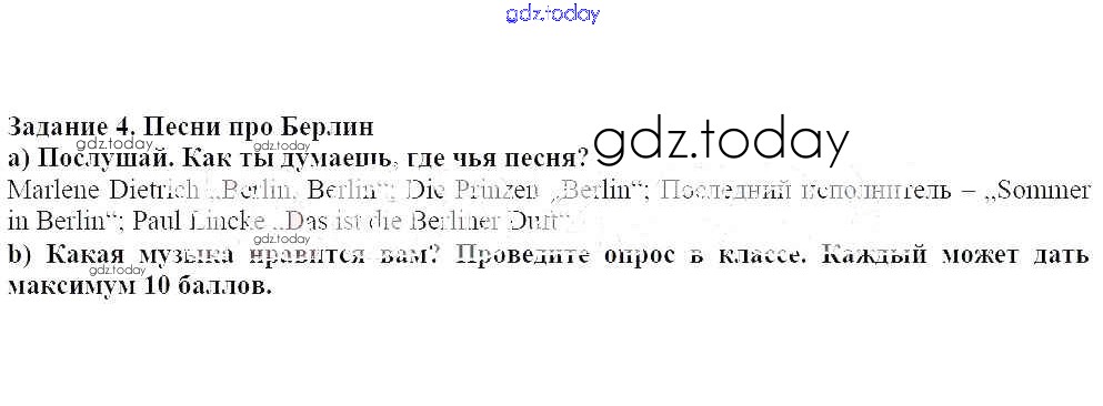 На страницах сайта gdz.today вы найдете учебный и вспомогательный материал, направленный на улучшения знаний школьной программы. ГДЗ - онлайн мир знаний Решение к главе 4. Воздух Берлина 4 Учебнику по Немецкому языку для 8 класса Аверин, Джин Просвещение Horizonte 2016