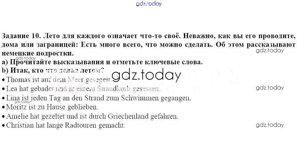 На страницах сайта gdz.today вы найдете учебный и вспомогательный материал, направленный на улучшения знаний школьной программы. ГДЗ - онлайн мир знаний Раздел 1 Решение к главе 1. Летом было замечательно! 10 Учебнику по Немецкому языку для 8 класса Бим, Садомова Просвещение 2014