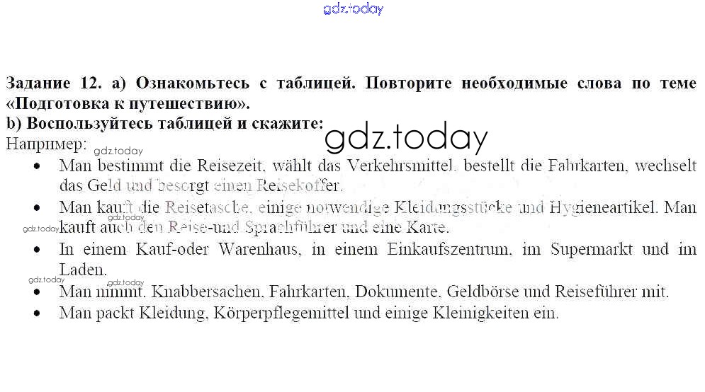 На страницах сайта gdz.today вы найдете учебный и вспомогательный материал, направленный на улучшения знаний школьной программы. ГДЗ - онлайн мир знаний Раздел 1 Решение к главе 3. Мы готовимся к путешествию по Германии 12 Учебнику по Немецкому языку для 8 класса Бим, Садомова Просвещение 2014