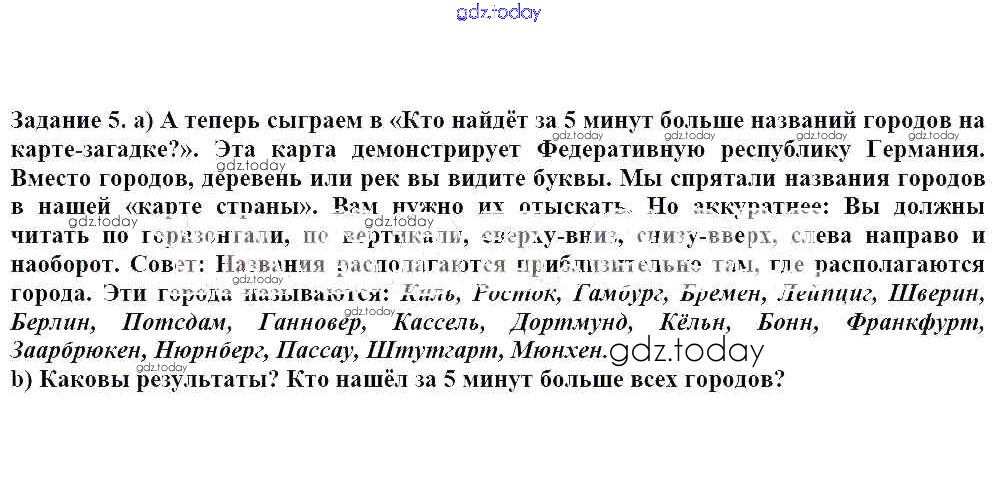 На страницах сайта gdz.today вы найдете учебный и вспомогательный материал, направленный на улучшения знаний школьной программы. ГДЗ - онлайн мир знаний Раздел 1 Решение к главе 3. Мы готовимся к путешествию по Германии 5 Учебнику по Немецкому языку для 8 класса Бим, Садомова Просвещение 2014