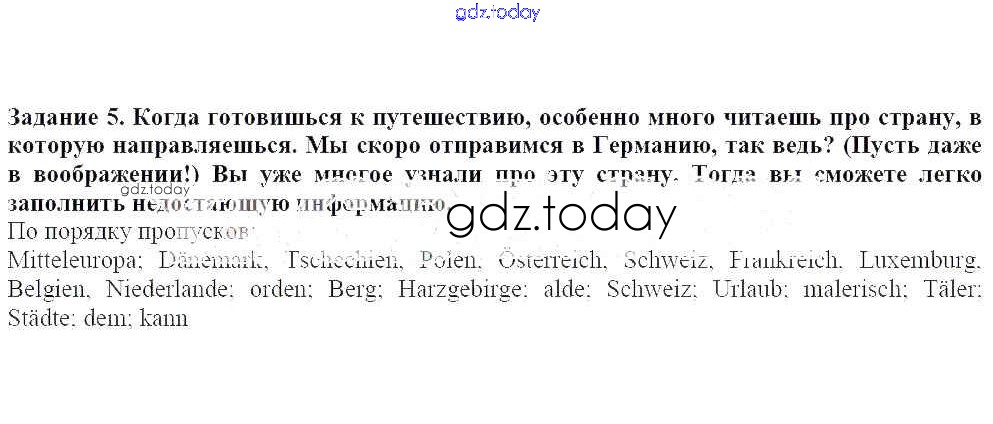 На страницах сайта gdz.today вы найдете учебный и вспомогательный материал, направленный на улучшения знаний школьной программы. ГДЗ - онлайн мир знаний Раздел 4 Решение к главе 3. Мы готовимся к путешествию по Германии 5 Учебнику по Немецкому языку для 8 класса Бим, Садомова Просвещение 2014