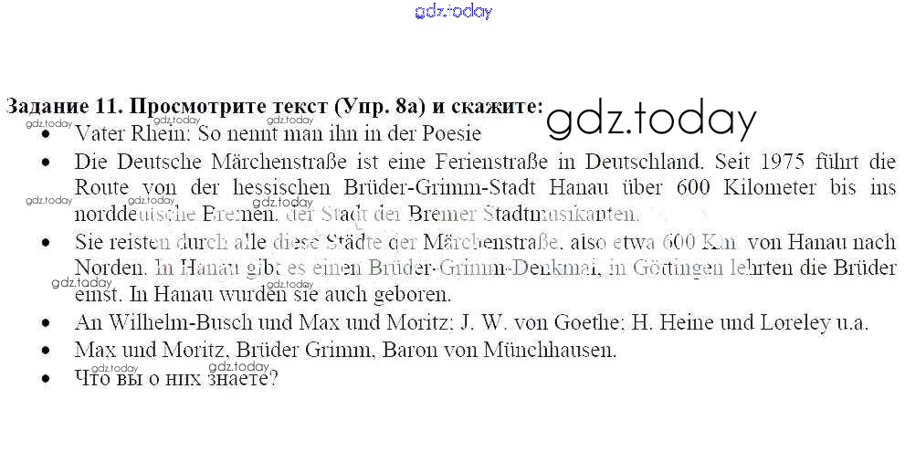На страницах сайта gdz.today вы найдете учебный и вспомогательный материал, направленный на улучшения знаний школьной программы. ГДЗ - онлайн мир знаний Раздел 1 Решение к главе 4. Путешествие по Федеративной Республике Германия 11 Учебнику по Немецкому языку для 8 класса Бим, Садомова Просвещение 2014