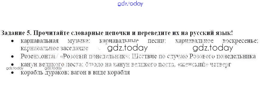На страницах сайта gdz.today вы найдете учебный и вспомогательный материал, направленный на улучшения знаний школьной программы. ГДЗ - онлайн мир знаний Решение к уроку 6. Карнавал с русскими гостями 5 Учебнику по Немецкому языку для 8 класса Радченко, Хебелер Дрофа Alles Klar! 2015