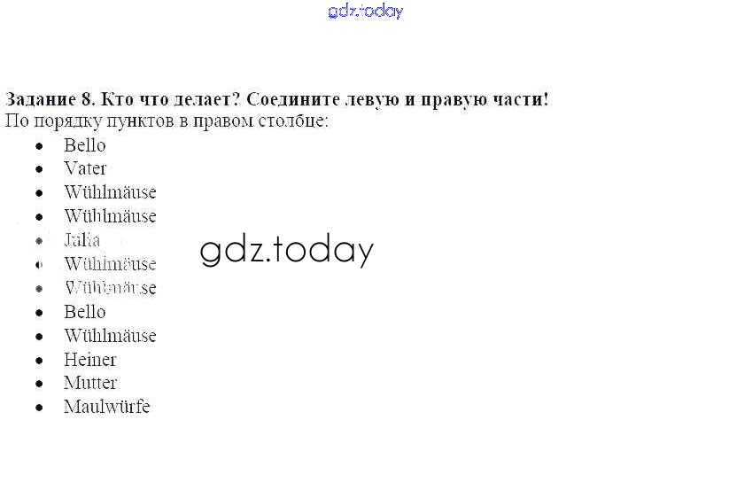 На страницах сайта gdz.today вы найдете учебный и вспомогательный материал, направленный на улучшения знаний школьной программы. ГДЗ - онлайн мир знаний Решение к уроку 8. Юные любители животных и вегетарианцы 8 Учебнику по Немецкому языку для 8 класса Радченко, Хебелер Дрофа Alles Klar! 2015