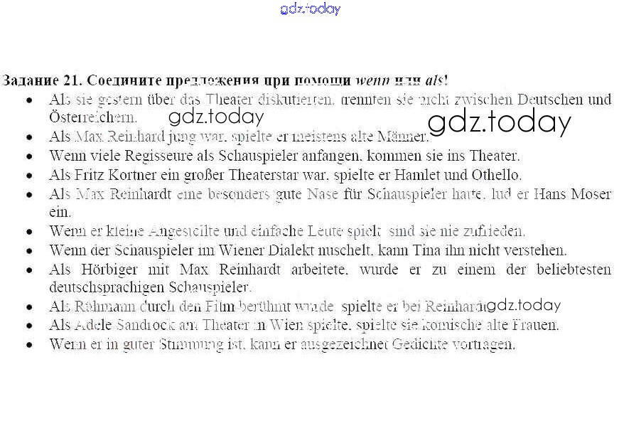 На страницах сайта gdz.today вы найдете учебный и вспомогательный материал, направленный на улучшения знаний школьной программы. ГДЗ - онлайн мир знаний Решение к уроку 13. Жизнь – это театр 21 Учебнику по Немецкому языку для 8 класса Радченко, Хебелер Дрофа Alles Klar! 2015