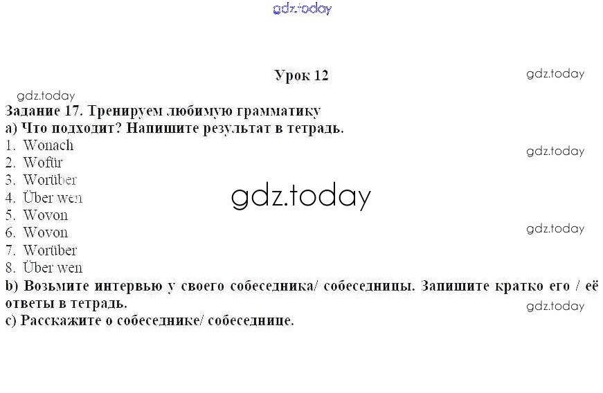На страницах сайта gdz.today вы найдете учебный и вспомогательный материал, направленный на улучшения знаний школьной программы. ГДЗ - онлайн мир знаний Решение к главе 1. Школьный обмен 17 Учебнику по Немецкому языку для 8 класса Радченко, Конго Углубленный уровень Просвещение Wunderkinder Plus 2019
