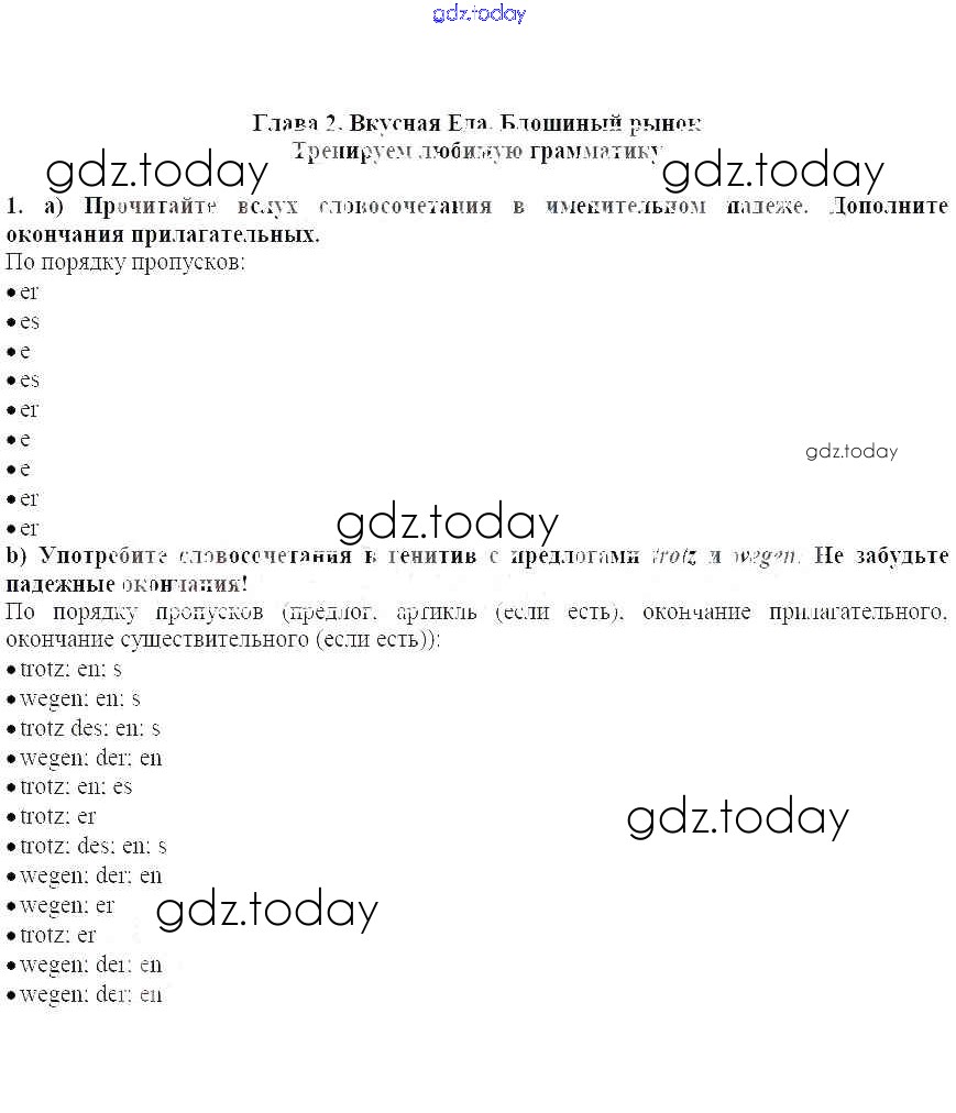На страницах сайта gdz.today вы найдете учебный и вспомогательный материал, направленный на улучшения знаний школьной программы. ГДЗ - онлайн мир знаний Тренируем любимую грамматику Решение к главе 2. Вкусная еда. Блошиный рынок 1 Учебнику по Немецкому языку для 8 класса Радченко, Конго Углубленный уровень Просвещение Wunderkinder Plus 2019