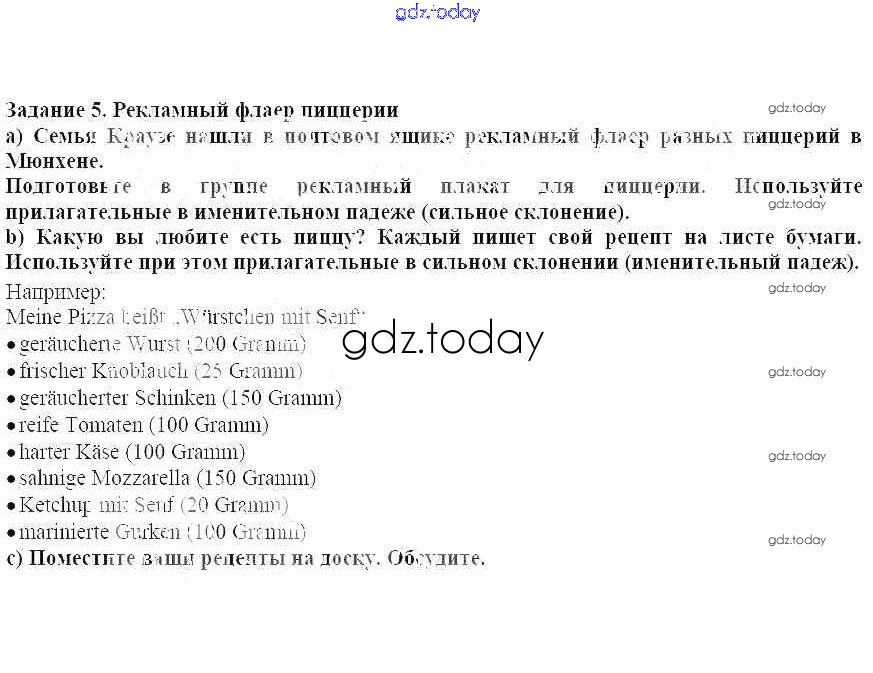 На страницах сайта gdz.today вы найдете учебный и вспомогательный материал, направленный на улучшения знаний школьной программы. ГДЗ - онлайн мир знаний Решение к главе 2. Вкусная еда. Блошиный рынок 5 Учебнику по Немецкому языку для 8 класса Радченко, Конго Углубленный уровень Просвещение Wunderkinder Plus 2019