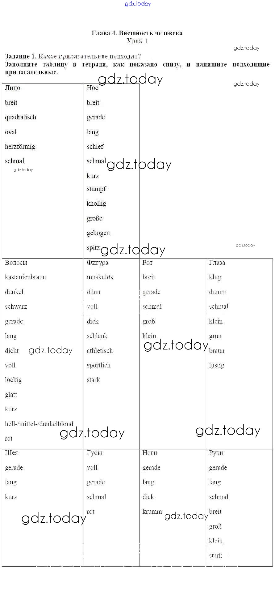 На страницах сайта gdz.today вы найдете учебный и вспомогательный материал, направленный на улучшения знаний школьной программы. ГДЗ - онлайн мир знаний Решение к главе 4. Внешность человека 1 Учебнику по Немецкому языку для 8 класса Радченко, Конго Углубленный уровень Просвещение Wunderkinder Plus 2019