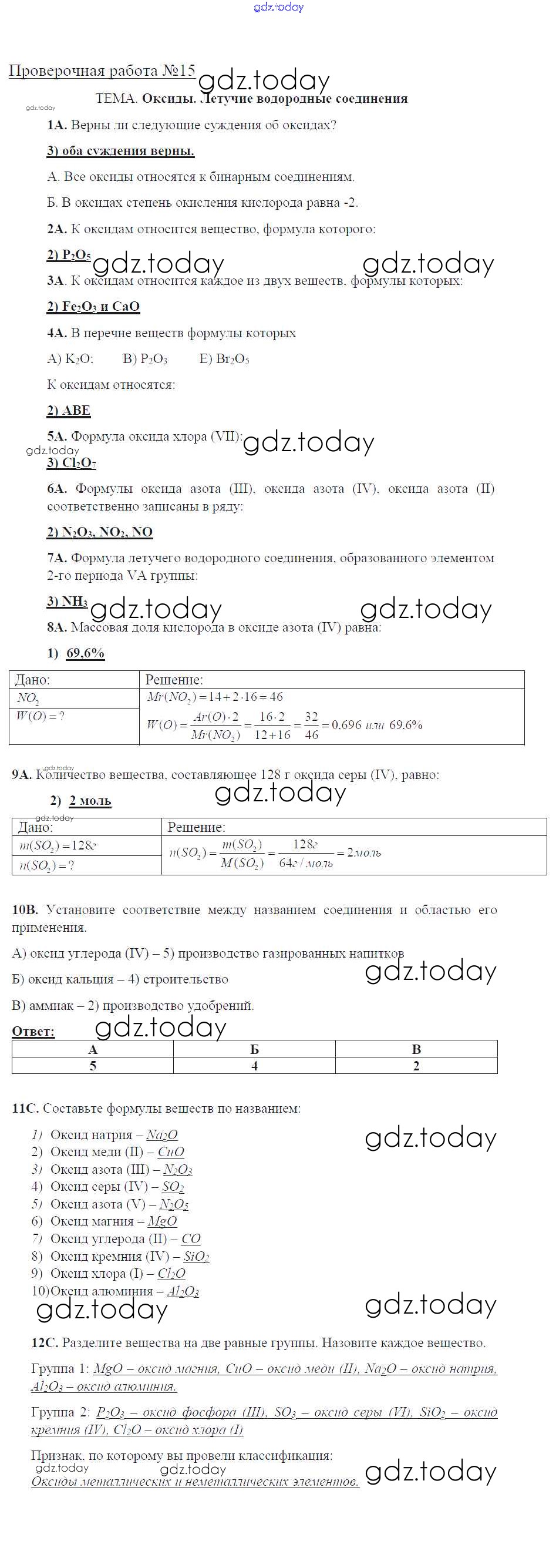 На страницах сайта gdz.today вы найдете учебный и вспомогательный материал, направленный на улучшения знаний школьной программы. ГДЗ - онлайн мир знаний Решение к проверочным работам 15 Тетради для оценки качества знаний по Химии для 8 класса Габриелян, Купцова Дрофа Вертикаль 2013
