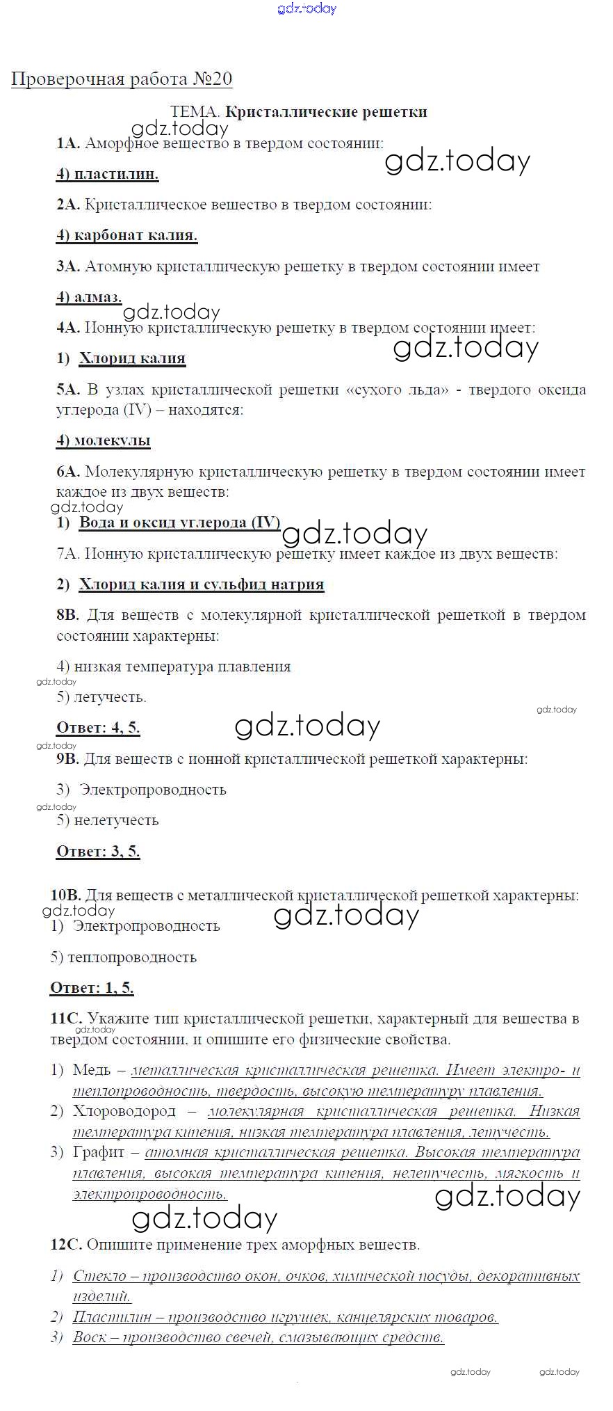 На страницах сайта gdz.today вы найдете учебный и вспомогательный материал, направленный на улучшения знаний школьной программы. ГДЗ - онлайн мир знаний Решение к проверочным работам 20 Тетради для оценки качества знаний по Химии для 8 класса Габриелян, Купцова Дрофа Вертикаль 2013