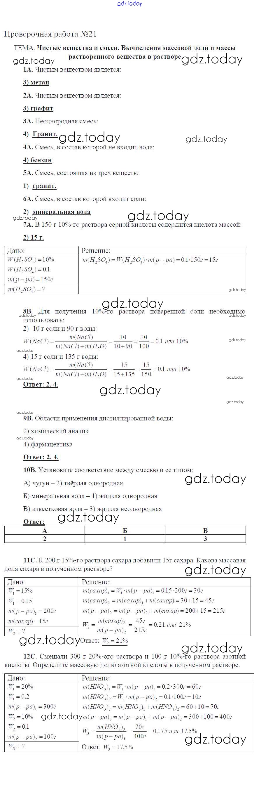 На страницах сайта gdz.today вы найдете учебный и вспомогательный материал, направленный на улучшения знаний школьной программы. ГДЗ - онлайн мир знаний Решение к проверочным работам 21 Тетради для оценки качества знаний по Химии для 8 класса Габриелян, Купцова Дрофа Вертикаль 2013