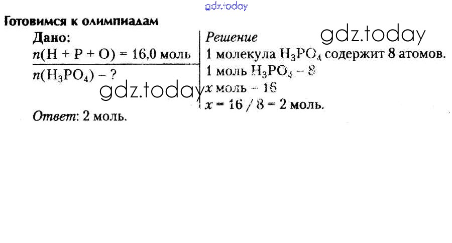 На страницах сайта gdz.today вы найдете учебный и вспомогательный материал, направленный на улучшения знаний школьной программы. ГДЗ - онлайн мир знаний Решение к §4. Моль — единица химического количества вещества. Постоянная Авогадро Готовимся к олимпиадам Учебнику по Химии для 8 класса Шиманович, Красицкий Народная асвета 2018