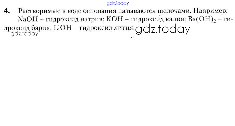 На страницах сайта gdz.today вы найдете учебный и вспомогательный материал, направленный на улучшения знаний школьной программы. ГДЗ - онлайн мир знаний Решение к §16. Основания 4 Учебнику по Химии для 8 класса Шиманович, Красицкий Народная асвета 2018