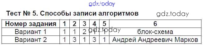 На страницах сайта gdz.today вы найдете учебный и вспомогательный материал, направленный на улучшения знаний школьной программы. ГДЗ - онлайн мир знаний Решение к тестам  Тест №5. Способы записи алгоритмов Контрольно-измерительным материалам (КИМ) по Информатике для 8 класса Масленикова  ВАКО  2017