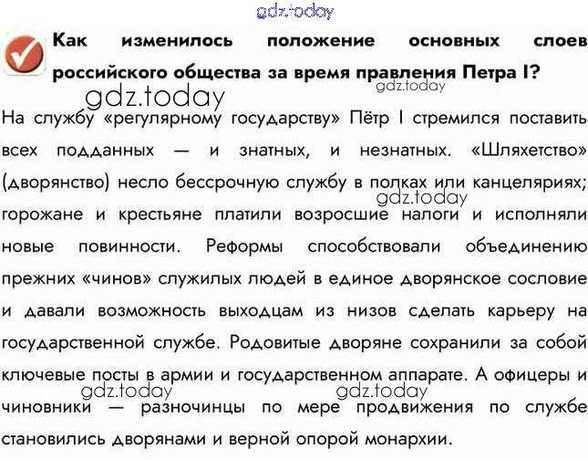 На страницах сайта gdz.today вы найдете учебный и вспомогательный материал, направленный на улучшения знаний школьной программы. ГДЗ - онлайн мир знаний Вопросы в начале параграфа §7 1 Учебнику по Истории России для 8 класса Арсентьев, Курукин Просвещение 2016