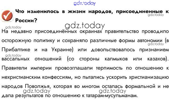 На страницах сайта gdz.today вы найдете учебный и вспомогательный материал, направленный на улучшения знаний школьной программы. ГДЗ - онлайн мир знаний Вопросы в начале параграфа Национальная и религиозная политика в 1725—1762 гг. 1 Учебнику по Истории России для 8 класса Арсентьев, Курукин Просвещение 2016