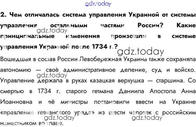 На страницах сайта gdz.today вы найдете учебный и вспомогательный материал, направленный на улучшения знаний школьной программы. ГДЗ - онлайн мир знаний Вопросы и задания Национальная и религиозная политика в 1725—1762 гг. 2 Учебнику по Истории России для 8 класса Арсентьев, Курукин Просвещение 2016
