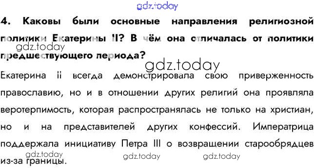 На страницах сайта gdz.today вы найдете учебный и вспомогательный материал, направленный на улучшения знаний школьной программы. ГДЗ - онлайн мир знаний Вопросы и задания Народы России. Национальная и религиозная политика Екатерины II 4 Учебнику по Истории России для 8 класса Арсентьев, Курукин Просвещение 2016