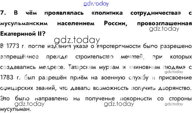 На страницах сайта gdz.today вы найдете учебный и вспомогательный материал, направленный на улучшения знаний школьной программы. ГДЗ - онлайн мир знаний Вопросы и задания Народы России. Национальная и религиозная политика Екатерины II 7 Учебнику по Истории России для 8 класса Арсентьев, Курукин Просвещение 2016