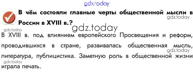 На страницах сайта gdz.today вы найдете учебный и вспомогательный материал, направленный на улучшения знаний школьной программы. ГДЗ - онлайн мир знаний Вопросы в начале параграфа Общественная мысль, публицистика, литература, пресса 1 Учебнику по Истории России для 8 класса Арсентьев, Курукин Просвещение 2016