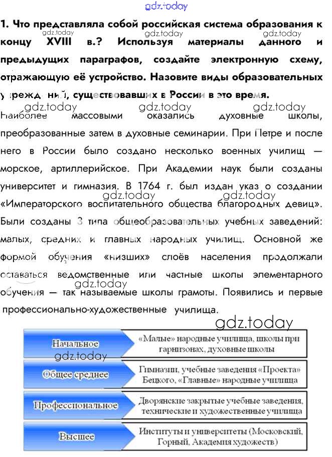 На страницах сайта gdz.today вы найдете учебный и вспомогательный материал, направленный на улучшения знаний школьной программы. ГДЗ - онлайн мир знаний Вопросы и задания Образование в России в XVIII в. 1 Учебнику по Истории России для 8 класса Арсентьев, Курукин Просвещение 2016
