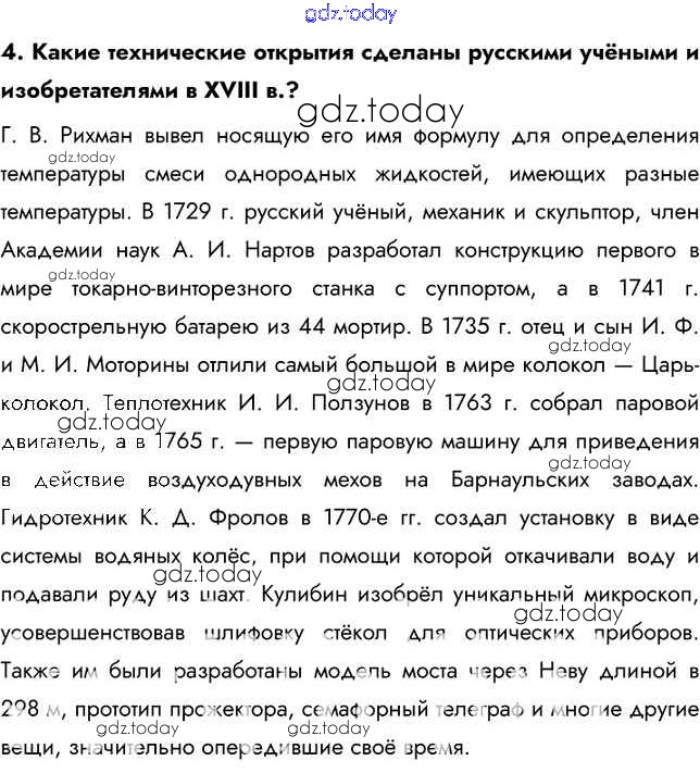 На страницах сайта gdz.today вы найдете учебный и вспомогательный материал, направленный на улучшения знаний школьной программы. ГДЗ - онлайн мир знаний Вопросы и задания Российская наука и техника в XVIII в. 4 Учебнику по Истории России для 8 класса Арсентьев, Курукин Просвещение 2016